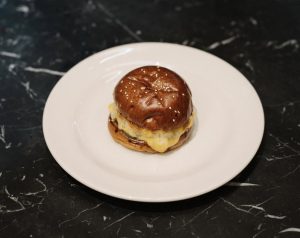 Se sirve en pan artesanal, dorado por fuera, esponjoso por dentro y con la fuerza necesaria para sostener todo sin deshacerse. Los toppings varían según temporada y disponibilidad, pero siempre están pensados para equilibrar: nada se siente de más. La lógica es clara: que cada elemento sume, no que compita.
